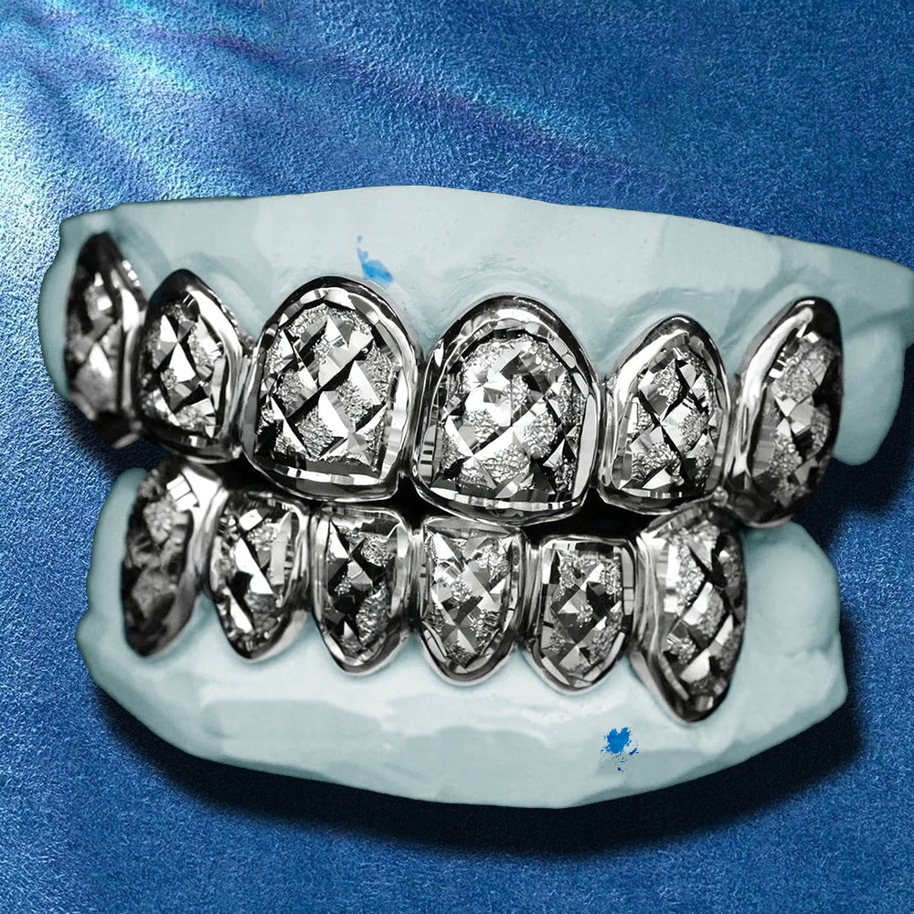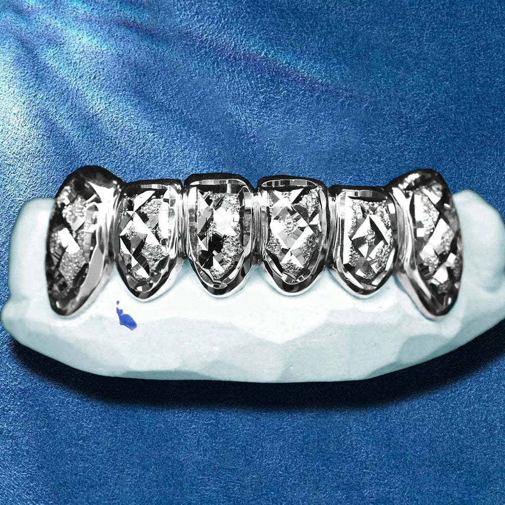 Diamond Dust Silver Grillz – Solid 925 Sterling Silver Custom Diamond Cut Teeth Jewelry Full Set