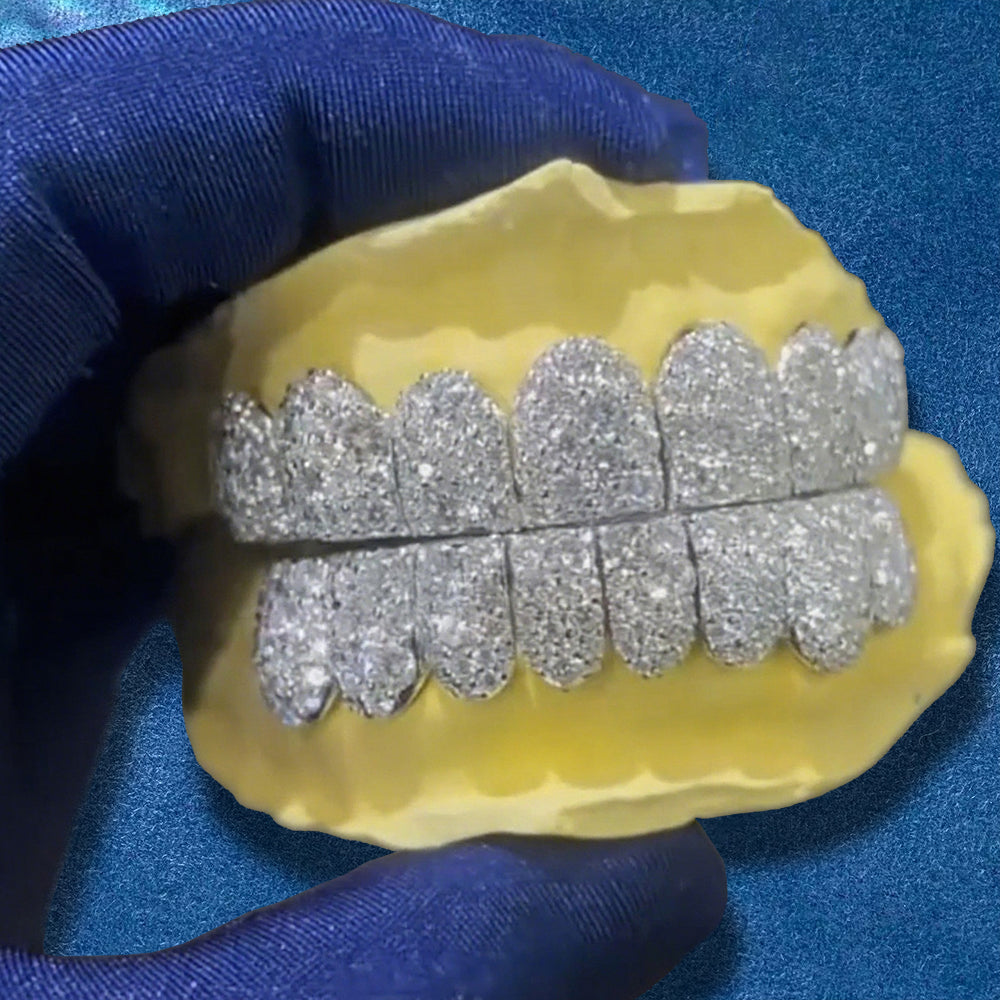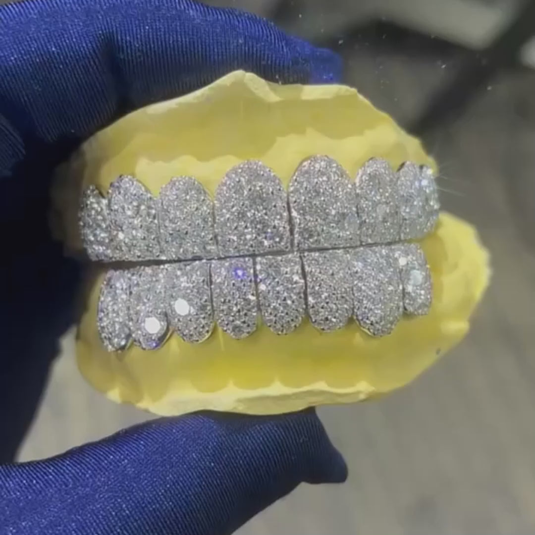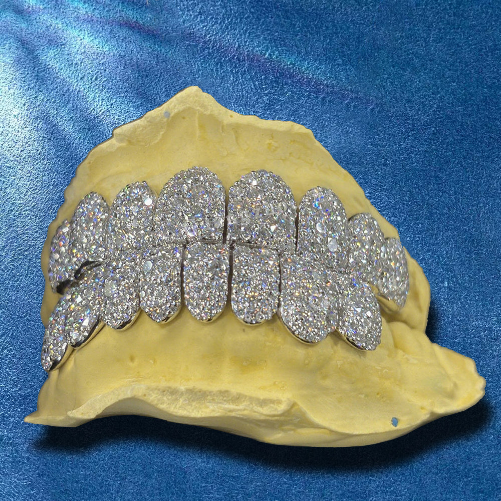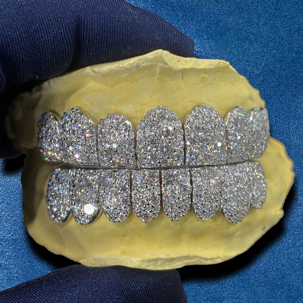 Iced Out Grillz Custom Fit - VVS Moissanite in Sterling Silver | Hip Hop Teeth Grill for Men Women
