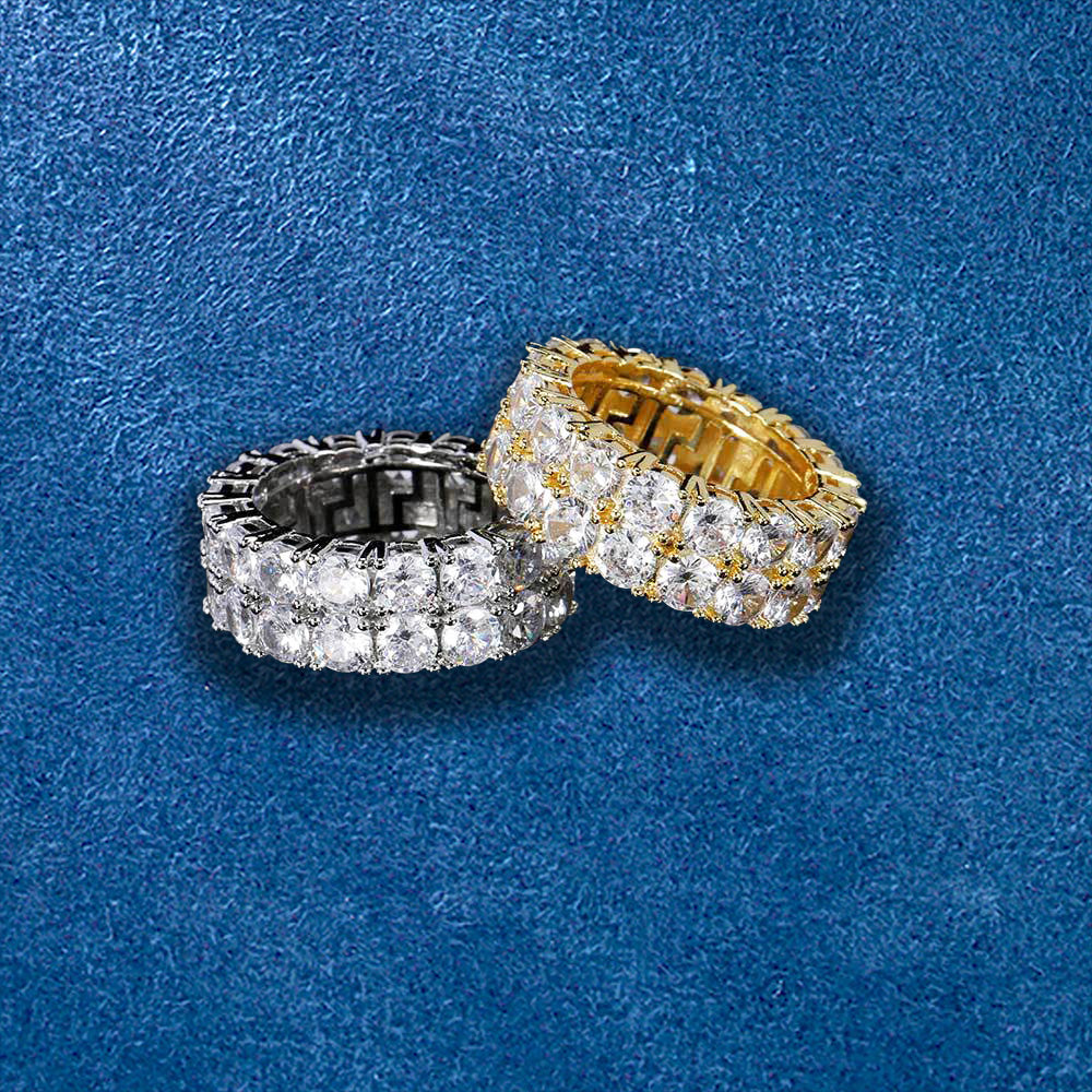 Featuring two rows of meticulously set, round-cut CZ stones, this ring delivers a stunning display of sparkle and shine from every angle. A true piece of hip-hop jewelry, the perfectly symmetrical design exudes refinement and luxury, making it the ideal accessory for both everyday wear and special occasions. Whether you're leveling up your look for a night out or adding a touch of elegance to your daily style, this ring is designed to make a statement. Make a lasting impression with this piece—a flawless blend of sophistication, sparkle, and undeniable style.