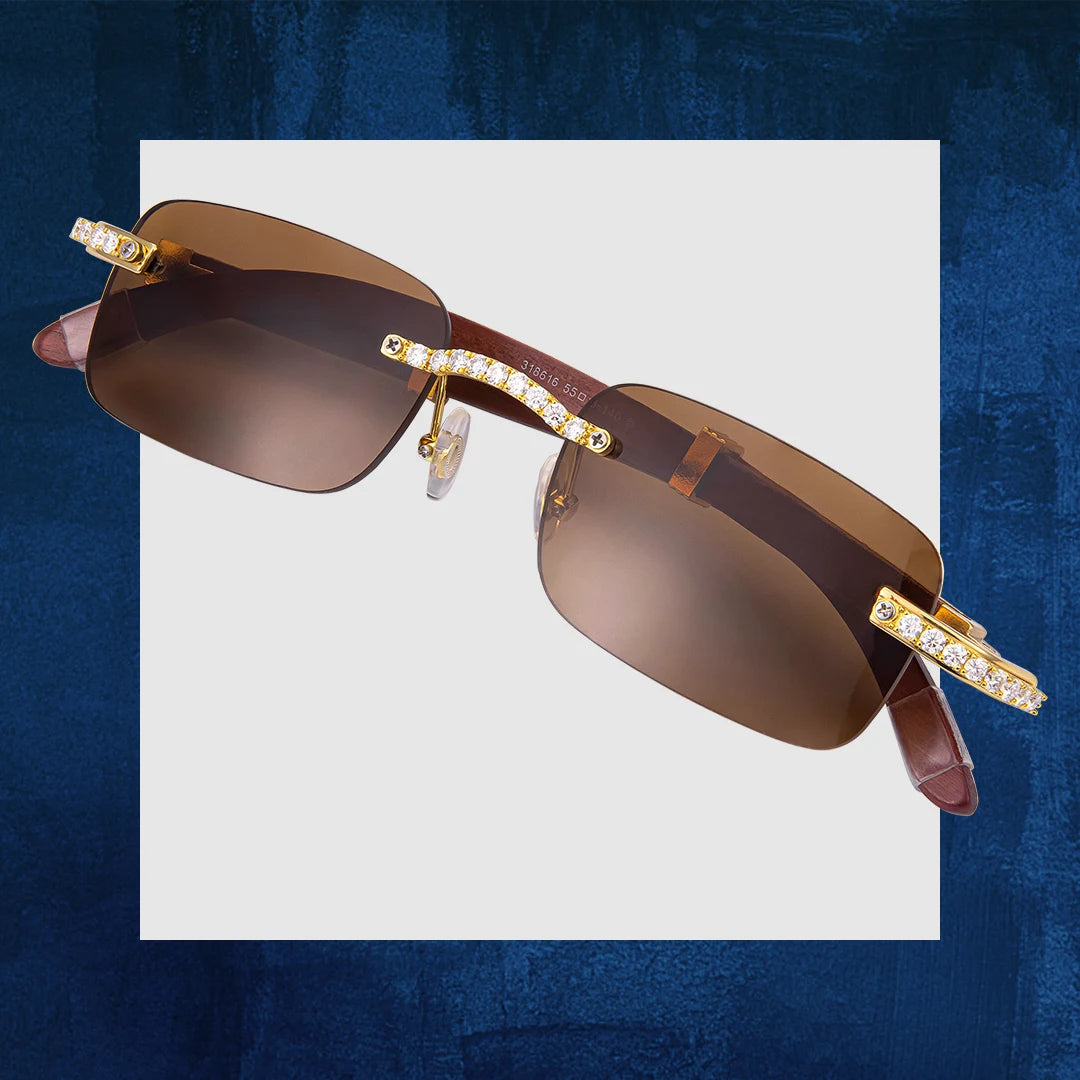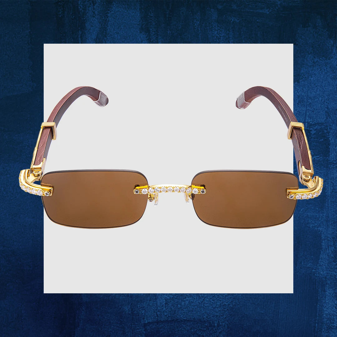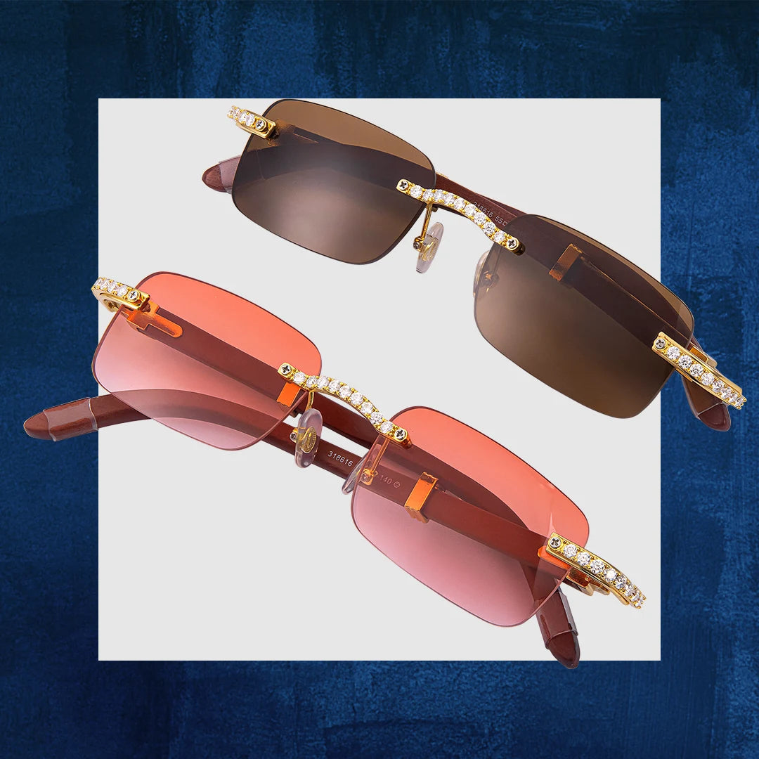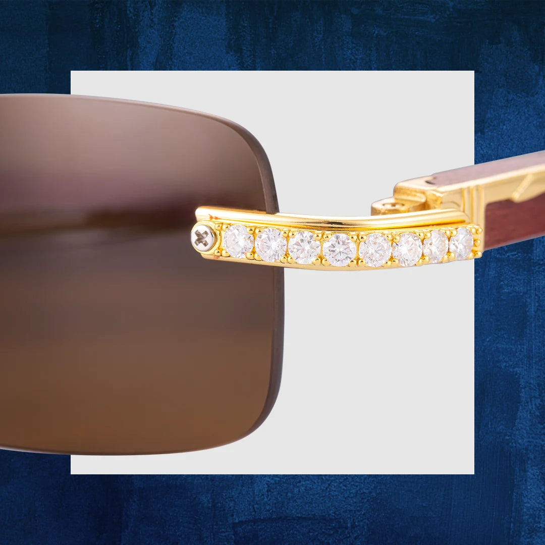 These sunglasses coming with a woody material adds a different stylish vibe on you. Its symbolic feature  highlights that gleamy moissanite stones around the glasses. Wearing it and level up your style!