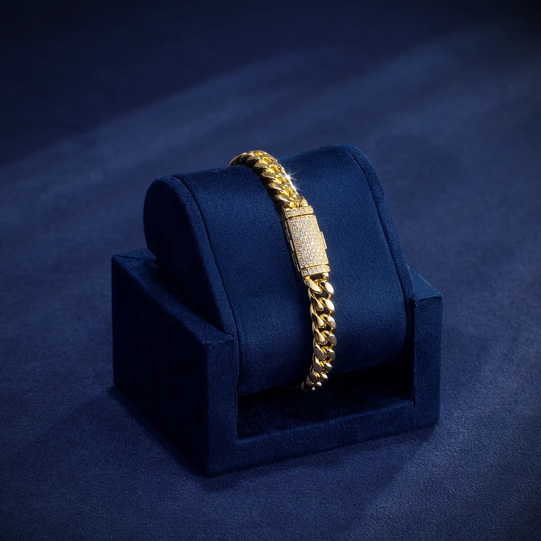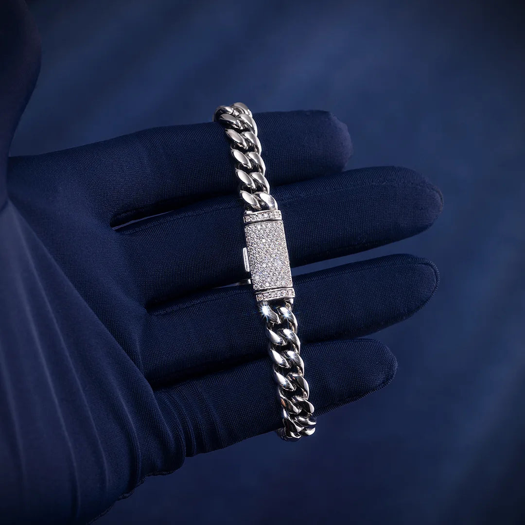 Miami cuban bracelet is classcial style in streetwear fashoin. Iced out clasp with miami cuban link bracelet, it will be indispensable in your daily wear. This chain is Stainless Steel cuban link with Silver Moissanite BOX clasp style.