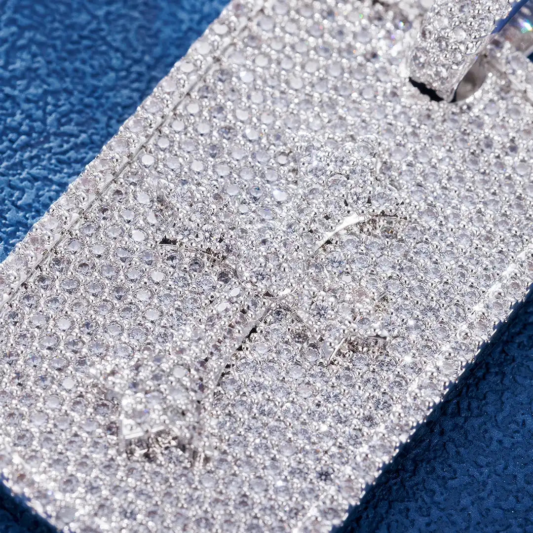 Brilliant pavé-set cluster round carve makes up this beautiful cross pendant crafted in moissanite stones and 925 silver. There is a rectangle as a background material. And the cross is carved over it.