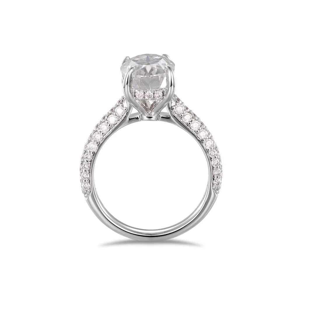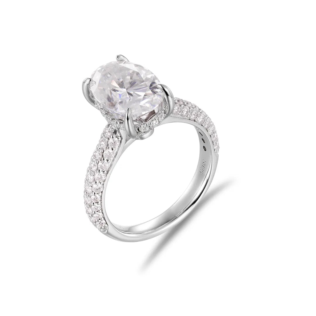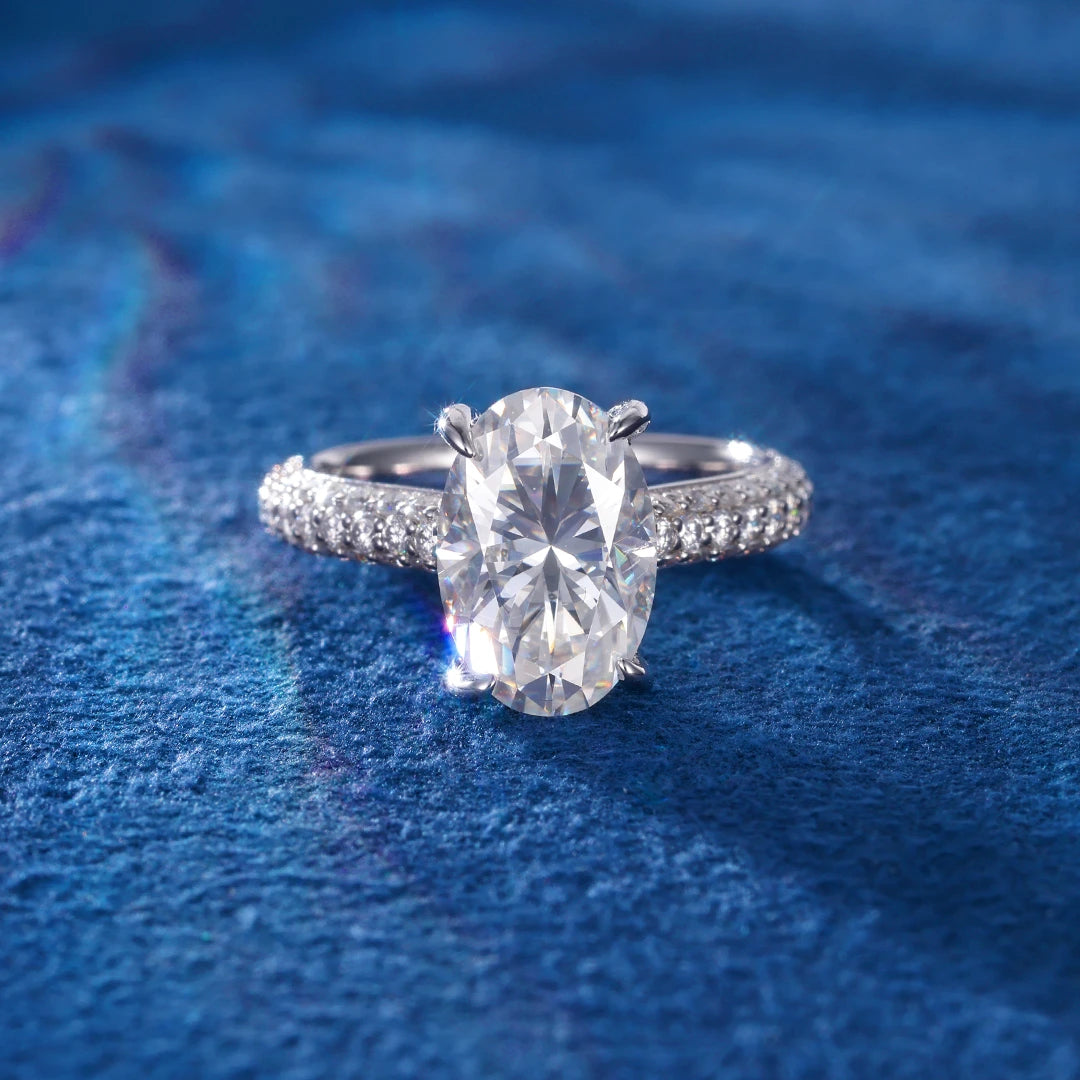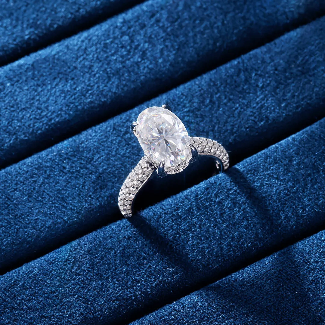 Artfully crafted from triple row moissanite, and Crafted with a 3.5ct oval cut Moissanite center stone and a unique hidden halo setting, it is truly exquisite. Its classic design and timeless beauty make it perfect for a proposal or special occasion.