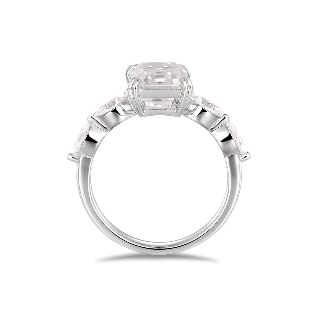 Crafted with precision, this Moissanite Versailles Engagement Ring features an emerald cut stone and two pear cut stones on the sides. This exquisite ring showcases the finest materials to ensure a stunning look that will last the test of time.