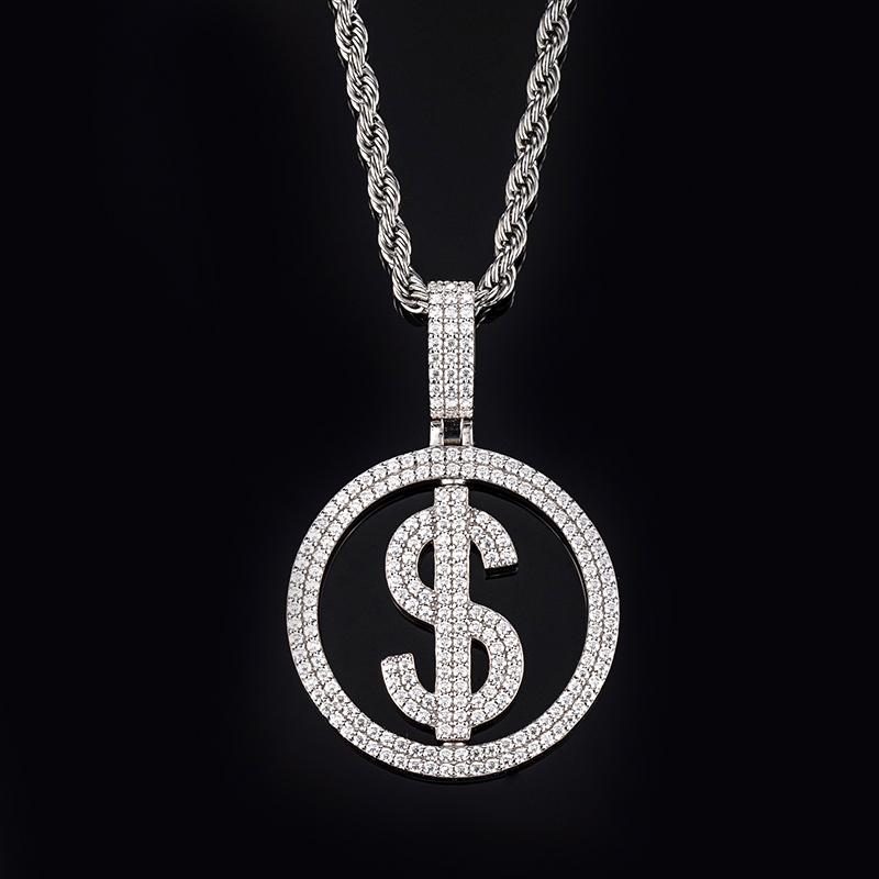 Finished in real white gold plating, this piece was meticulously crafted with hand-set blue round cut VVS Moissanite stones.The middle $ sign can spin, this exclusive piece doubles as the perfect jewelry accessory.