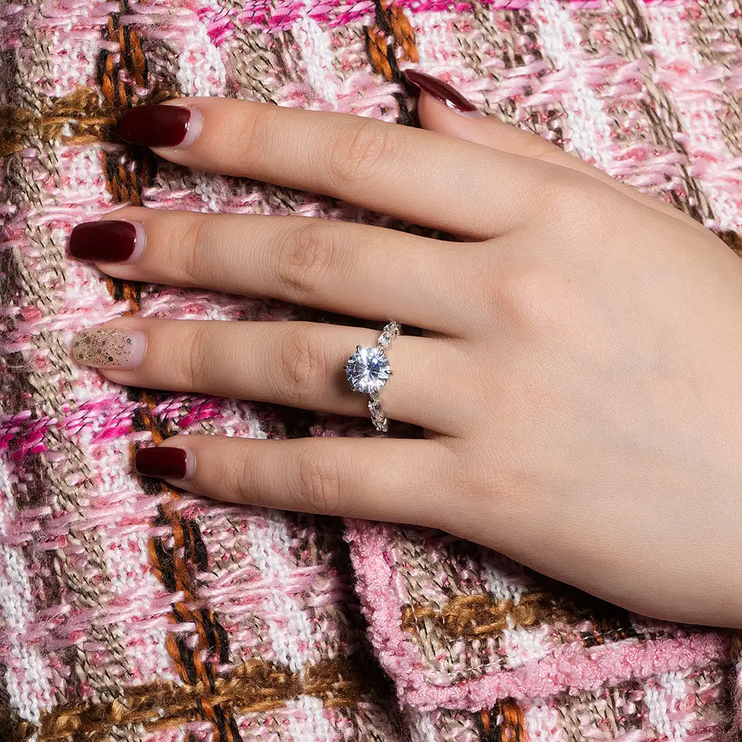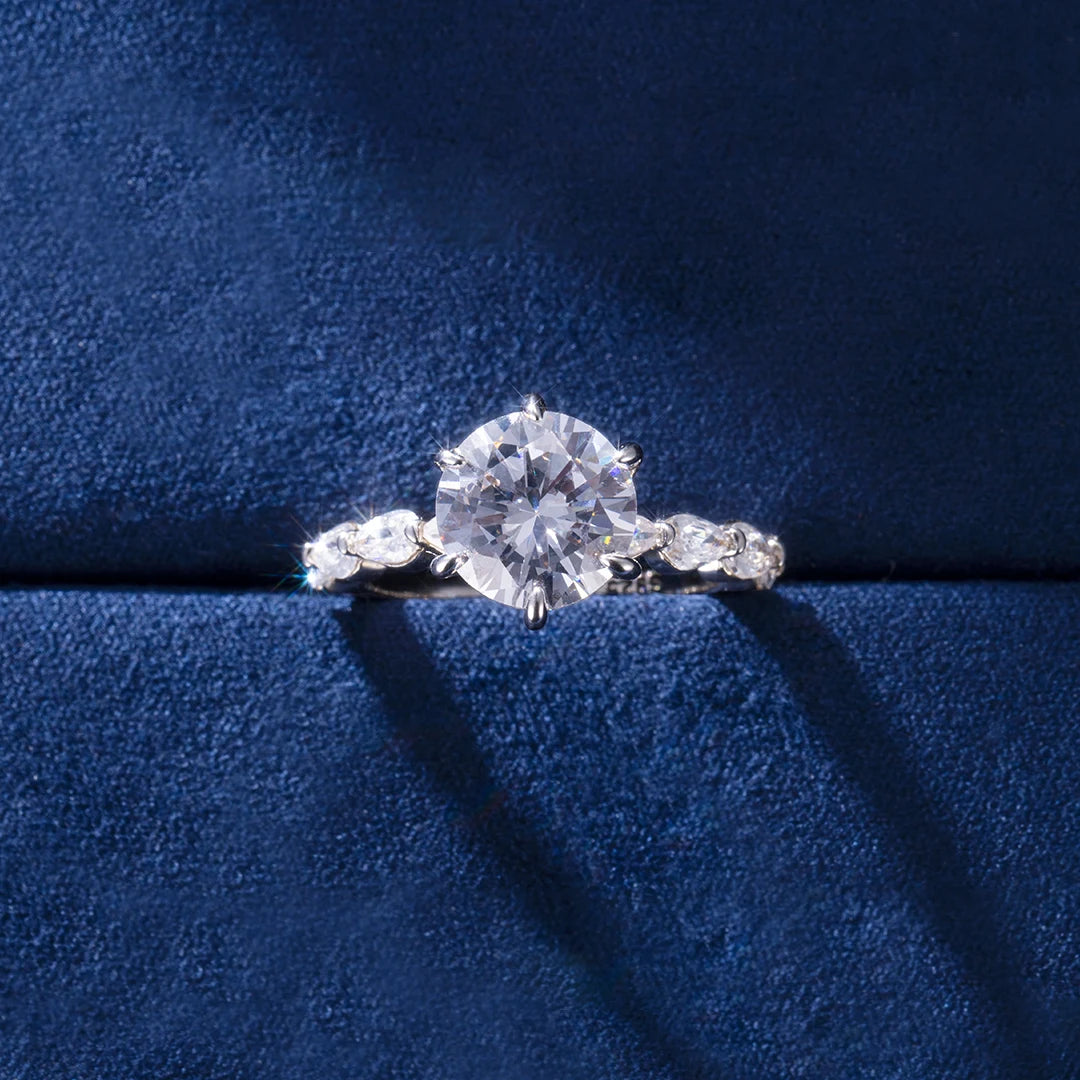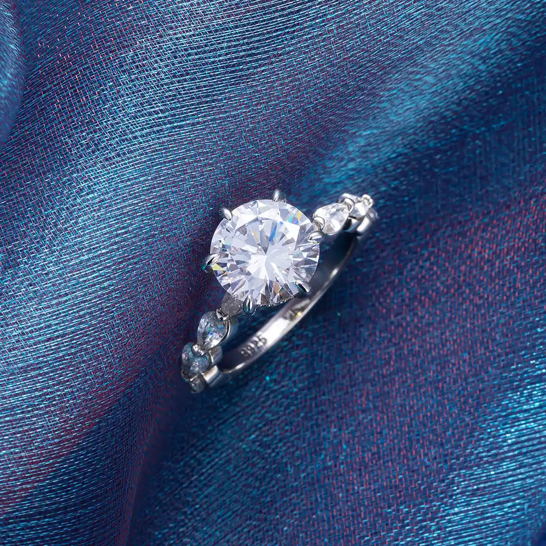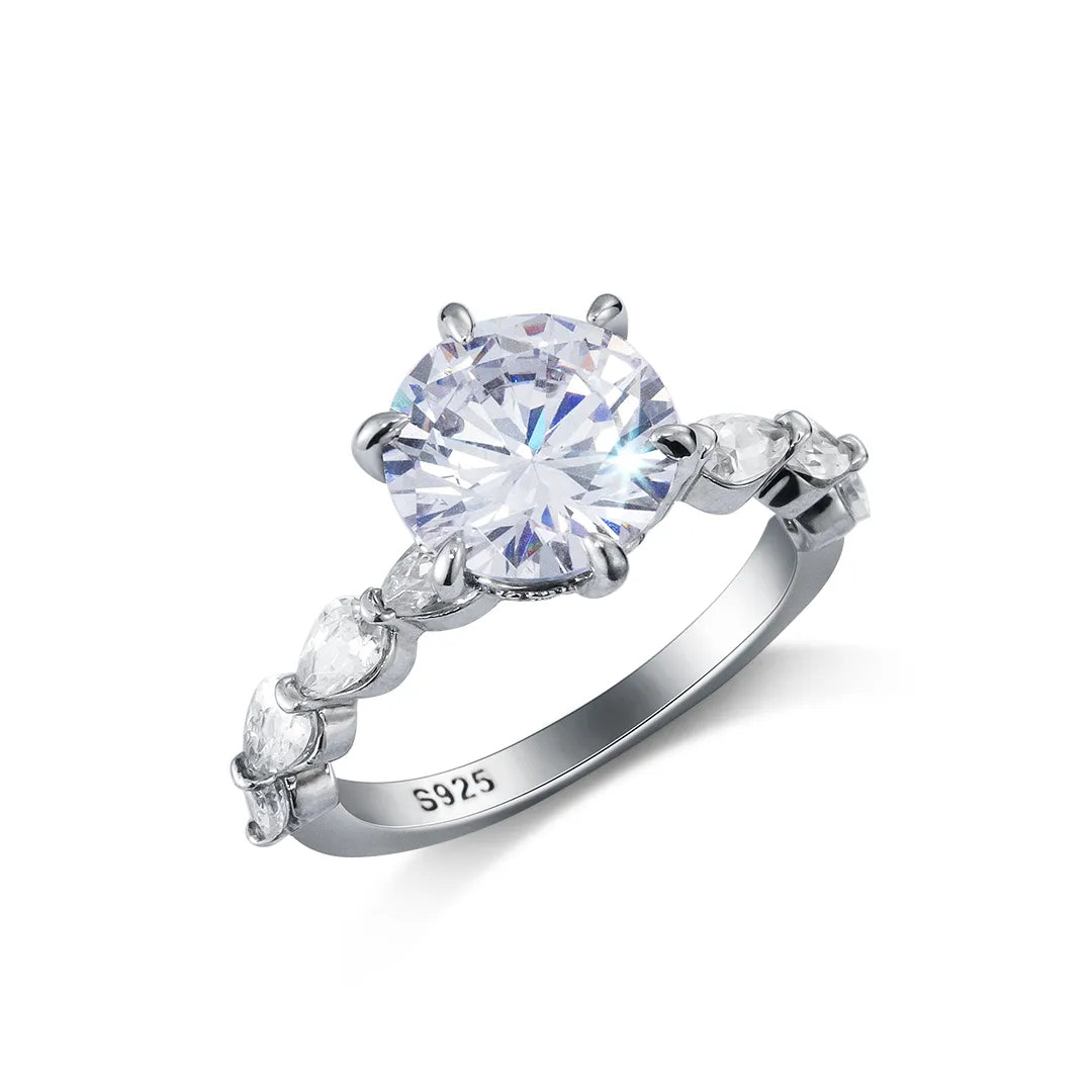 A new eternal moissanite engagement ring made using brilliant round-cut moissanite stone with pear cut stone side by Icezeus. The ring is greatly crafted in 925 sterling silver and fixed in a claw setting.