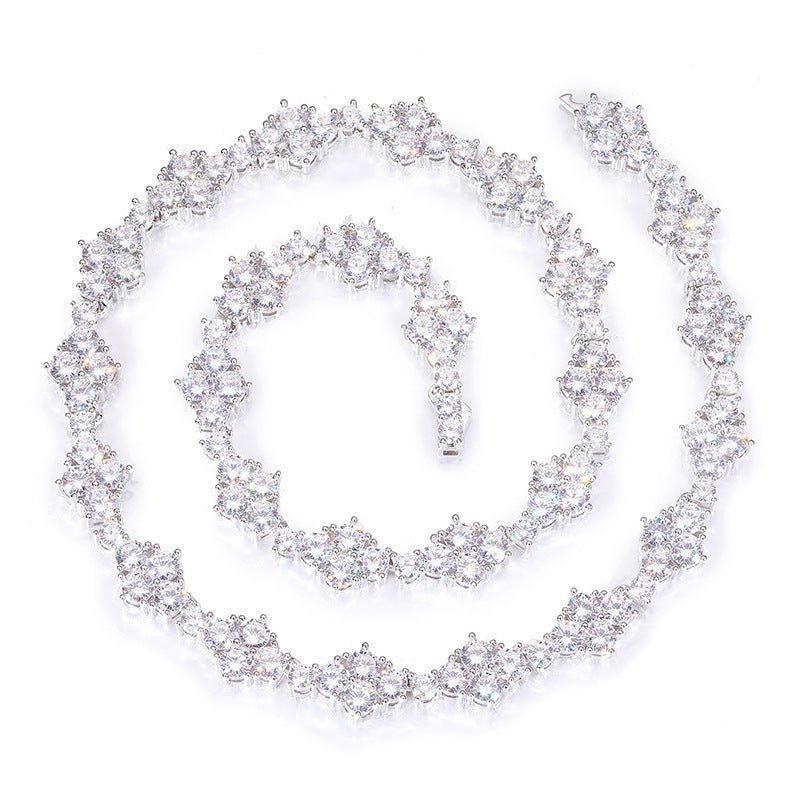 This 12mm CZ Stone Cross Pave Tennis Chain features 5mm and 4mm CZ stones woven into a cross design. Its unique design style and high-quality brass materials provide a sturdy and elegant look, perfect for any occasion.